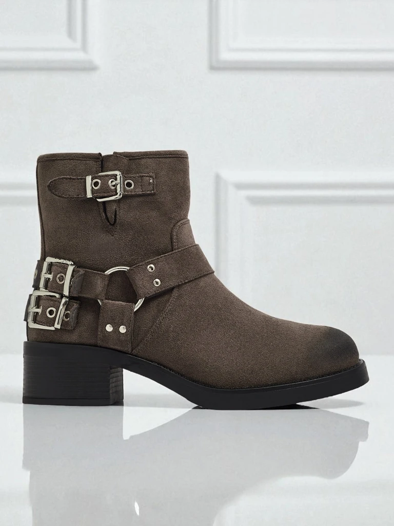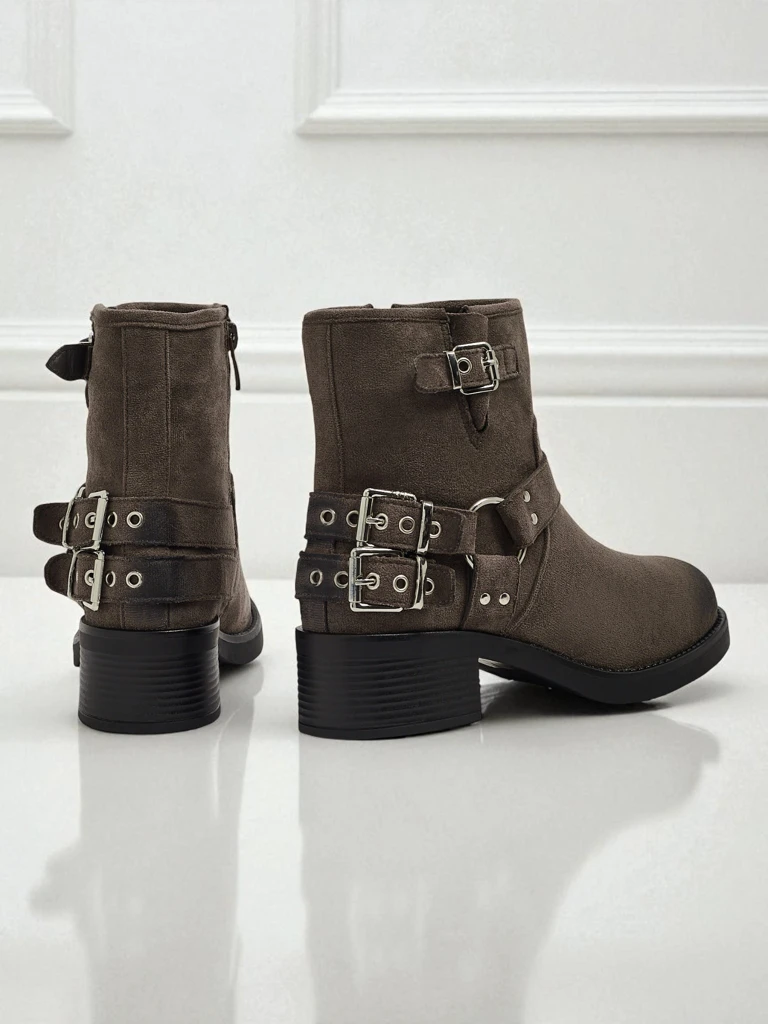- Жіночі ботильйони з екозамші з пряжками. Утеплені ніжним хутром, взуття застібається на блискавку. Прикрашені пряжками. Підходять до багатьох жіночих стилізацій!