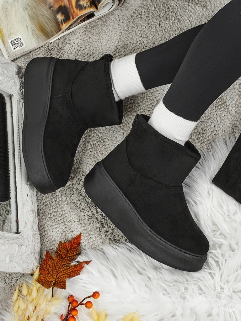 - Чудові жіночі зимові черевики-снігоходи на товстій підошві типу платформа. Верх виготовлений з екологічної замшевої шкіри, внутрішня частина утеплена хутром. Додатково мають застібний халяву. Ідеальна база на зиму!