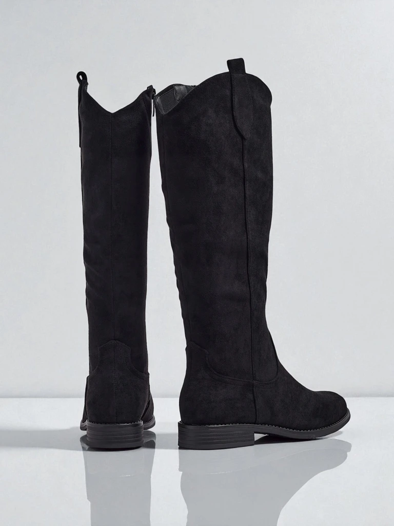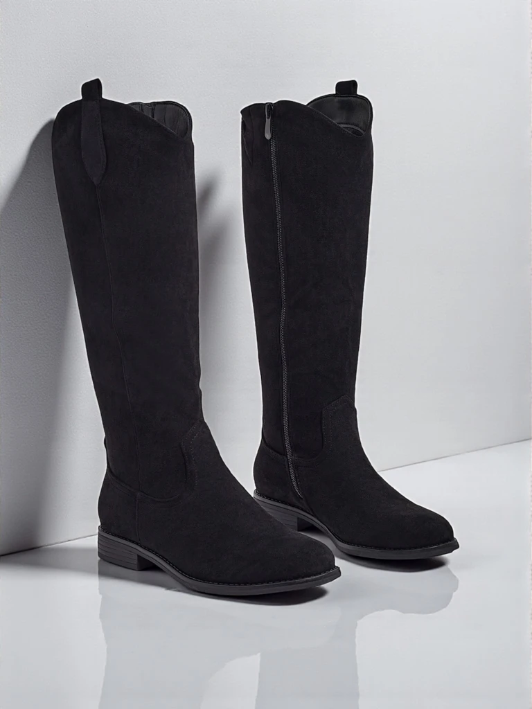 - Стильні жіночі чоботи до коліна на плоскій підошві. Халява виготовлена з еко замшевої шкіри, всередині утеплення у вигляді хутра. Модель застібається на блискавку. Ідеально підходять для повсякденних осінніх образів!