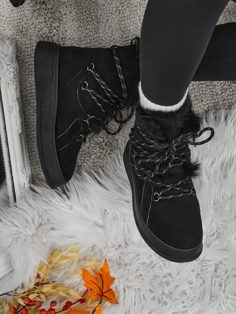 • Чудові жіночі зимові черевики-снігоходи на товстій підошві типу платформа. Верх виготовлений з екологічної замшевої шкіри, внутрішня частина утеплена хутром. Модель на шнурівці. Ідеальна база на зиму!