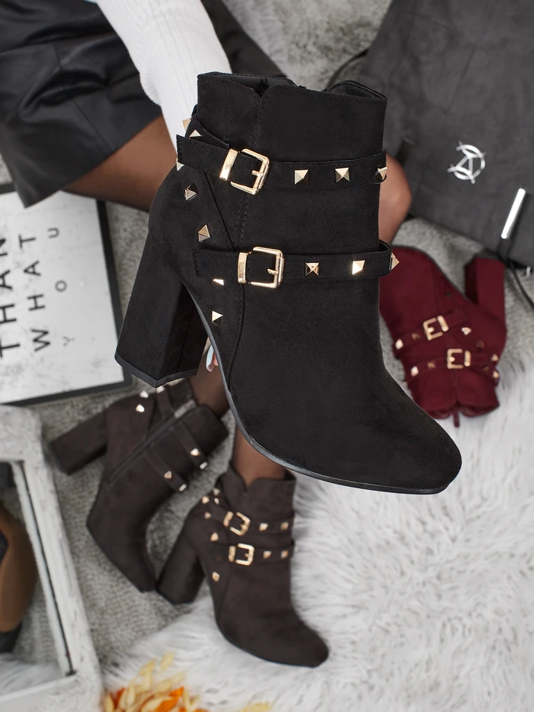 Charakterystycznym elementem są złote detale w postaci klamerek i ćwieków, które dodają botkom nieco punkowego charakteru. Słupkowy obcas o wysokości 9 cm zapewnia stabilność i wygodę podczas noszenia, a zamek błyskawiczny z tyłu ułatwia zakładanie i ściąganie.
