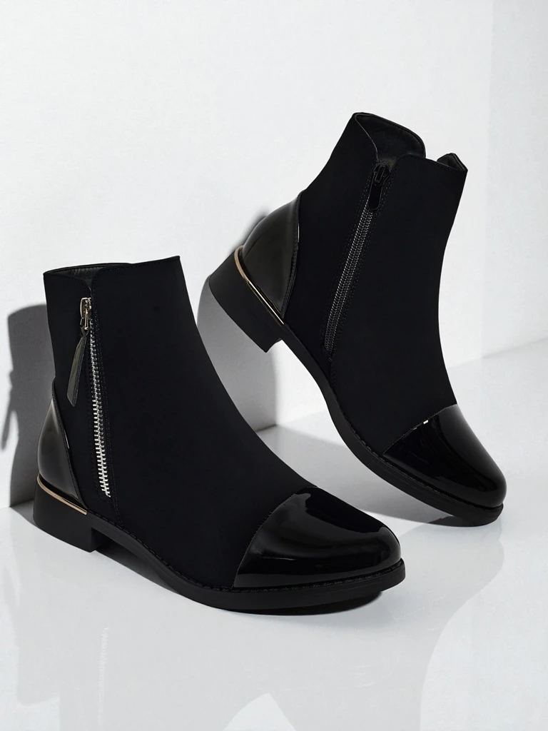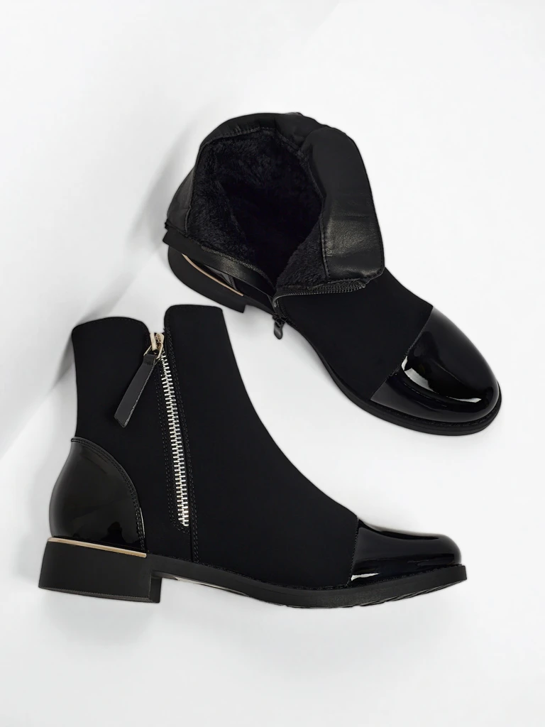 - Чудові жіночі ботильйони на товстій підошві, виготовлені з поєднання еко шкіри лакованої та матової. Внутрішня частина з делікатного хутра гарантує тепло в холодні дні. Модель застібається на блискавку.