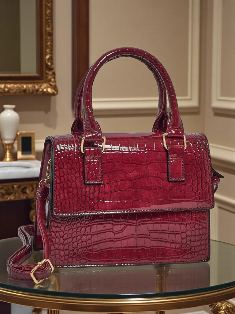 - Маленька сумочка з тисненням, виготовлена з комбінації еко шкіри лакованої та еко замші. 1 відділення, 2 кишеньки, замок та знімний регульований ремінець. Стиль та функціональність у досконалому виконанні.