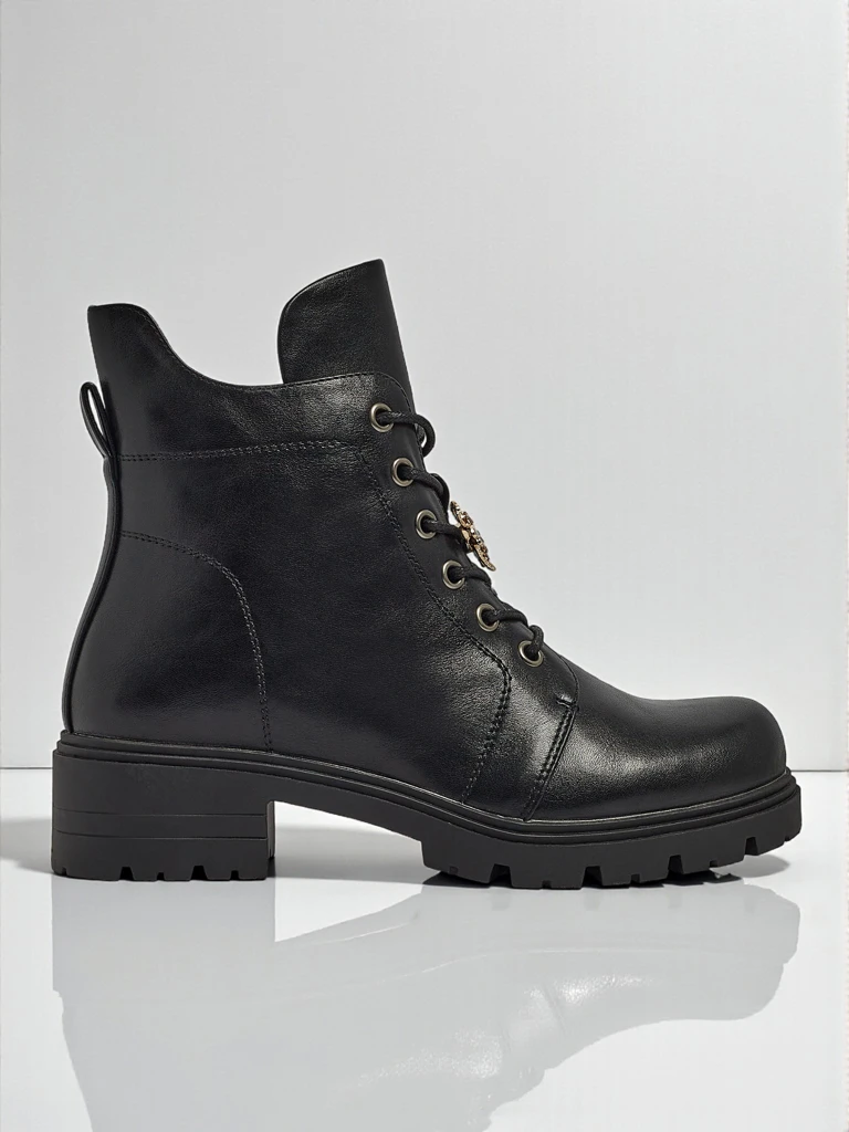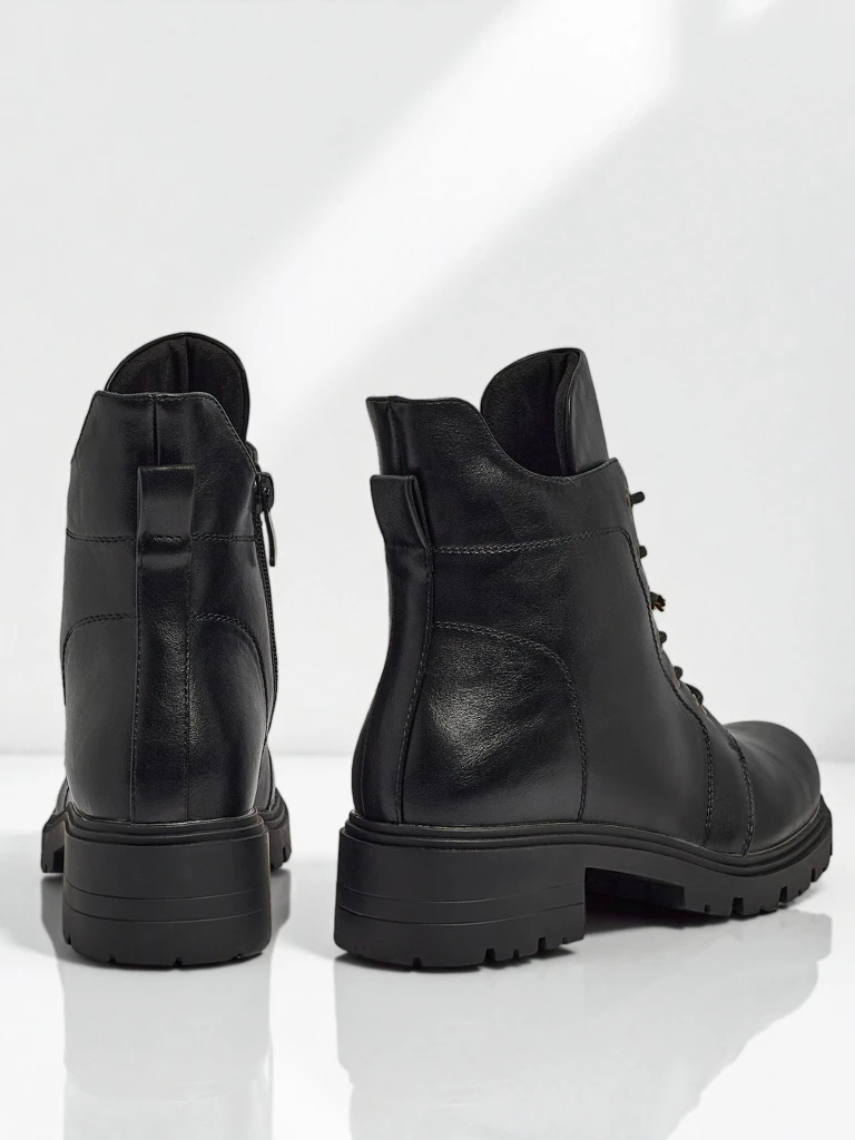- Жіночі ботильйони з екошкіри, із застібкою-блискавкою та декоративною шнурівкою і круглим носком, додатково утеплені у вигляді хутра - сучасність, зручність та стиль в одному.