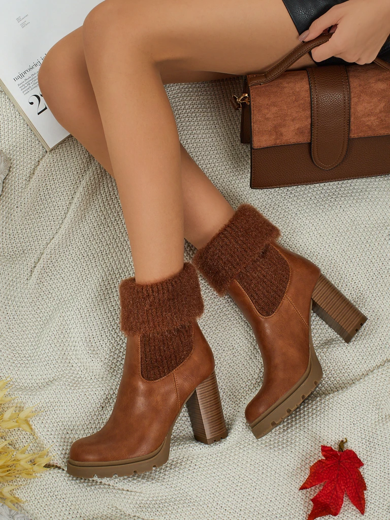 - Зручні ботильйони на підборах-стовпчику, виготовлені з екошкіри та вставкою з трикотажу. Модель взувається. Модель делікатно утеплена хутром. Ідеальний вибір на осінь!