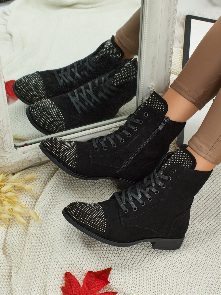 - Жіночі ботфорти з еко замші, на блискавці, зі шнурівкою та круглим носком, додатково утеплені хутром - сучасність, зручність та стиль в одному. Додатково передня частина халяви прикрашена цирконами.
