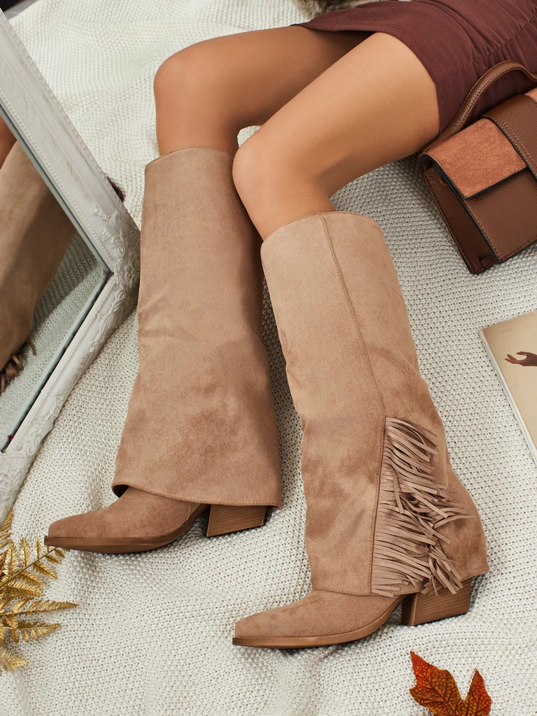 - Stylowe damskie kozaki do kolana na słupku. Cholewka wykonana jest z eko skóry zamszowej, w środku ocieplenie w formie futerka. Model zapinany na suwak, posiada dodatkową cholewkę oraz nosek w szpic. Idealne do codziennych jesiennych outfitów!
