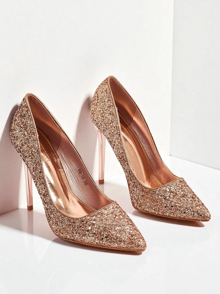 - Жіночі туфлі-човники з екошкіри на шпильці, з гострим носком. Покриті шаром грубшого, блискучого блискіток, поєднують елегантність з ніжним блиском, ідеальні для особливих випадків.