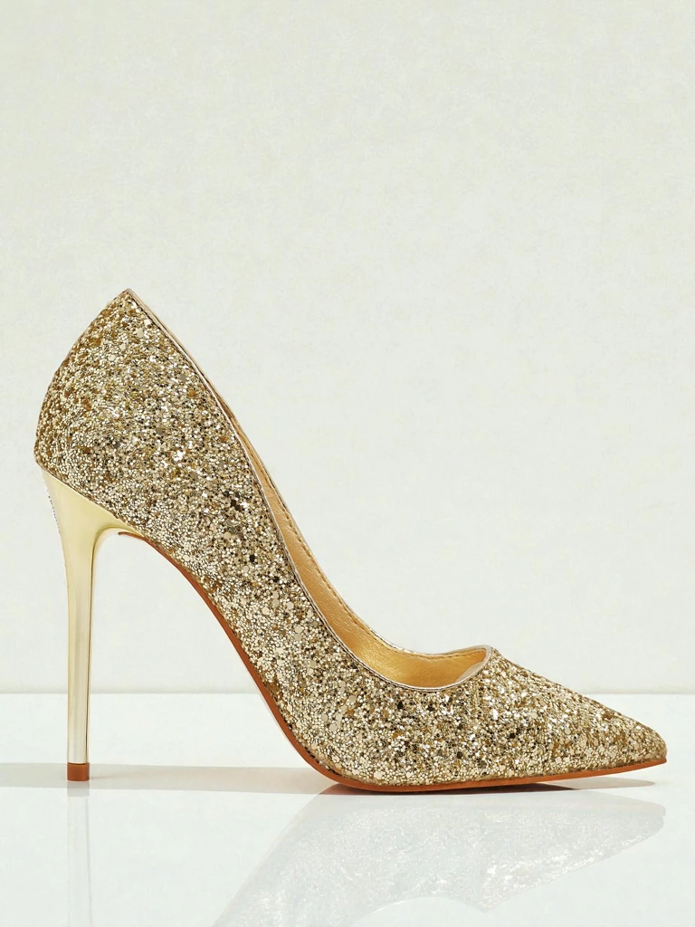- Жіночі туфлі-човники з екошкіри на шпильці, з гострим носком. Покриті шаром грубшого, блискучого блискіток, поєднують елегантність з ніжним блиском, ідеальні для особливих випадків.