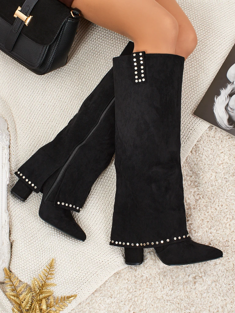 • Жіночі козаки на підборах, із загостреним носком, виготовлені з екологічної замшевої шкіри та додаткової, декоративної халяви з джетами. Взуття застібається на блискавку, утеплене всередині хутром. Підходять до багатьох жіночих стилізацій!