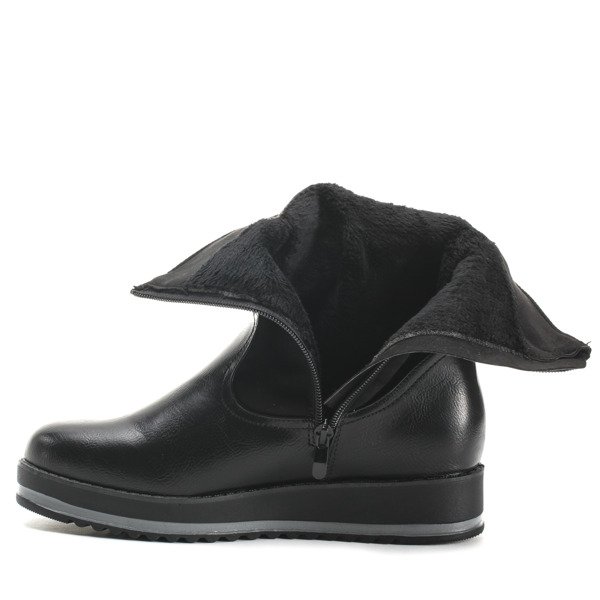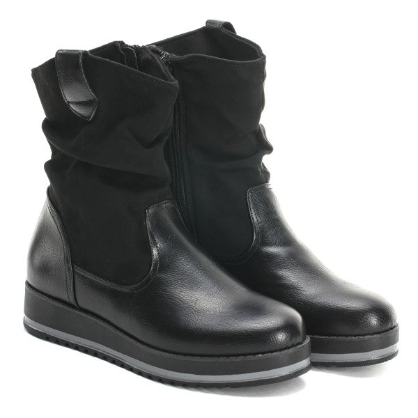 - Stylowe botki na płaskiej podeszwie. Przód i tył wykonane z ekoskóry, natomiast cholewka z zamszu. Buty są ocieplane, posiadają solidną i grubą podeszwę. Idealna propozycja dla pań w dobrym stylu.