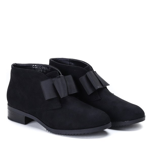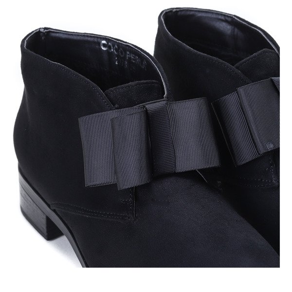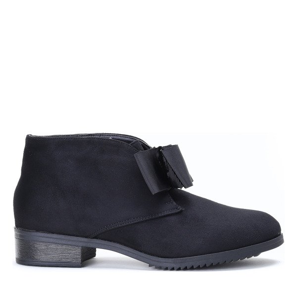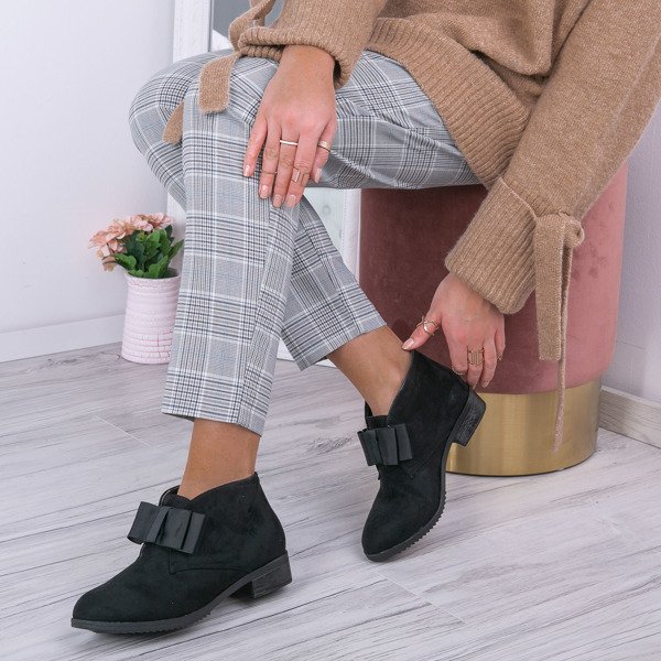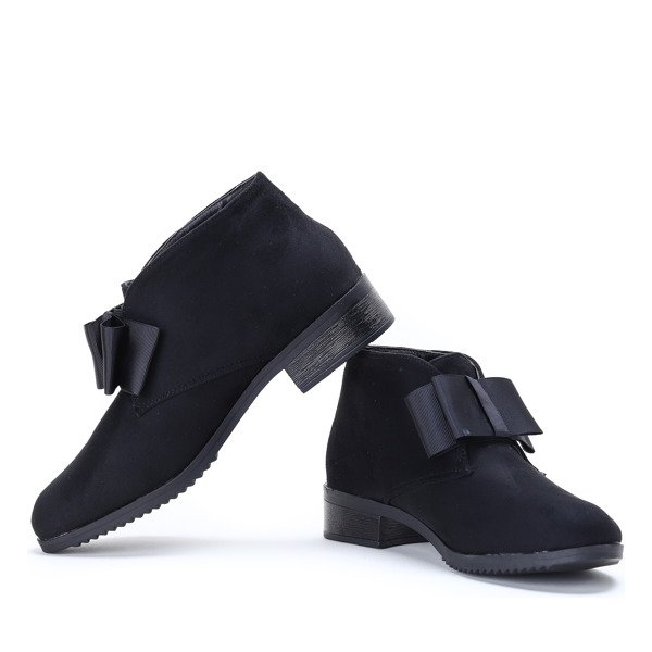 - Елегантні чорні чоботи на низькому каблуці. Матеріал - екологічна замша. У верхній частині є бантик, внутрішня частина утеплена хутром. Ніжна і елегантна форма взуття.