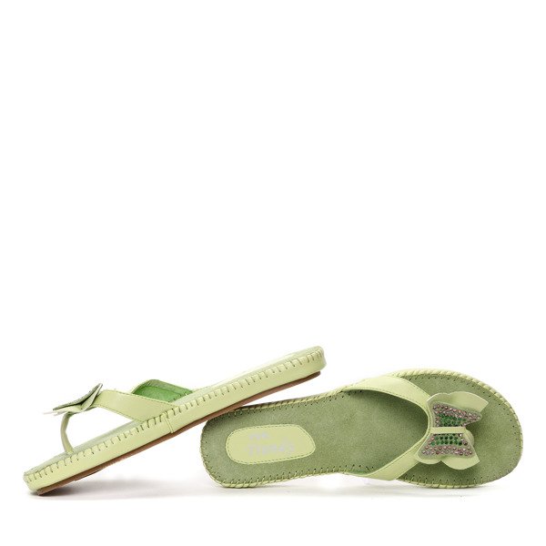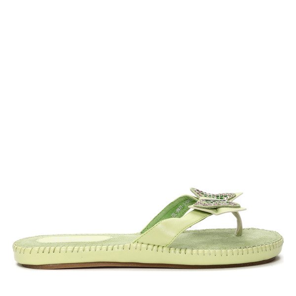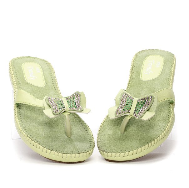 - Lekkie klapki japonki zdobione na przodzie kokardką z cyrkoniami. Obuwie wykonane z skóry ekologicznej, a podeszwa pokryta eko zamszem. Świetnie nadają się na plaże!