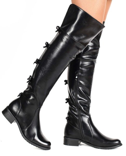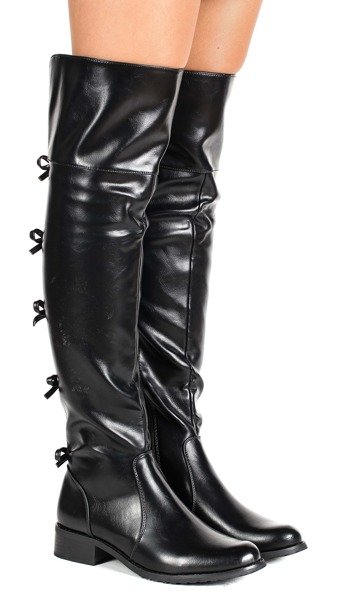 - Kozaki wykonane z ekoskóry, zapinane na zamek. Buty delikatnie ocieplane. W tylnej części znajdują się ozdobne kokardki. Idealne dla Pań w dobrym stylu!
