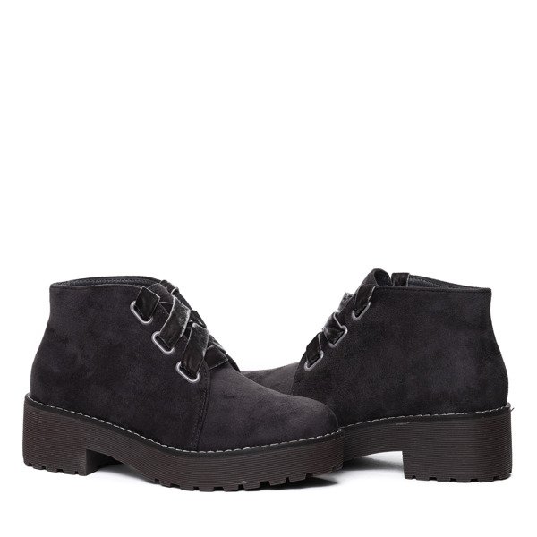 - Botki w najprostszym wydaniu, wykonane z miękkiego zamszu ekologicznego. Sznurówki z weluru. Wkładka pokryta ekologiczną skórą. Obuwie na 5 cm, płaskim obcasie. Solidnie wykonane i bardzo wygodne dzięki grubej podeszwie.