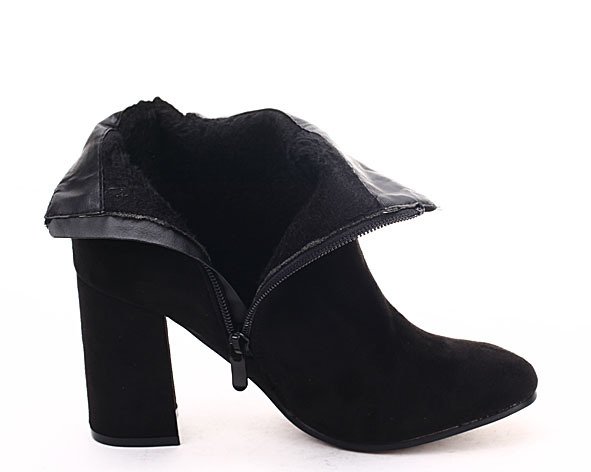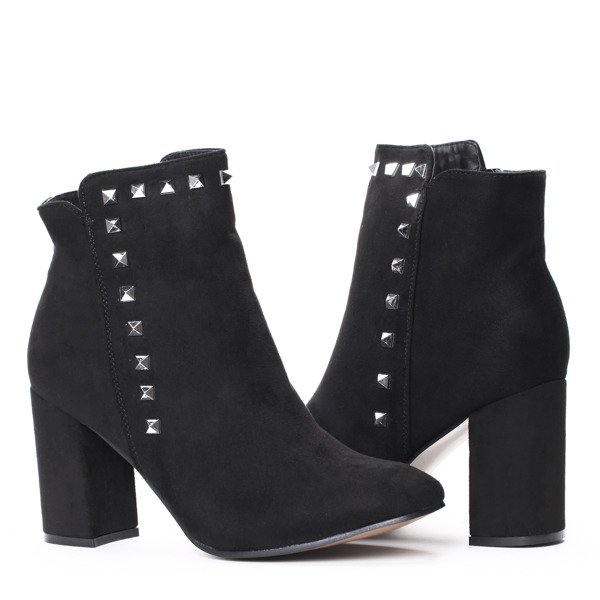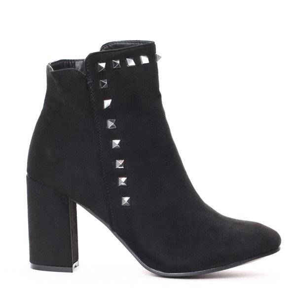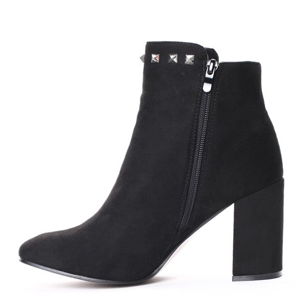 - Kobiece botki na słupku ozdobione srebrnymi ćwiekami. Cholewka zasuwana na suwak. Szeroki obcas gwarantuje stabilność. W środku delikatne ocieplenie. Idealne do eleganckich stylizacji.