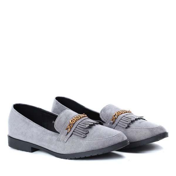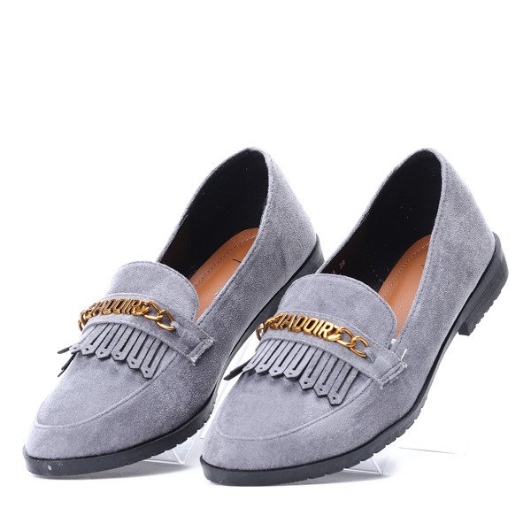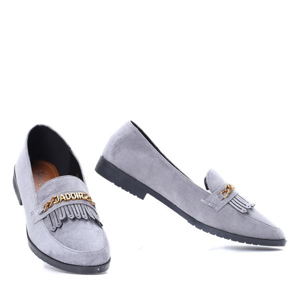 • Eleganckie mokasyny ze skóry ekologicznej zamszowej. Nosek z frędzelkami, zdobiony złotym łańcuszkiem z napisem "JADOIR". Model bardzo wygodny i solidnie wykonany.