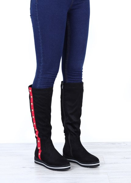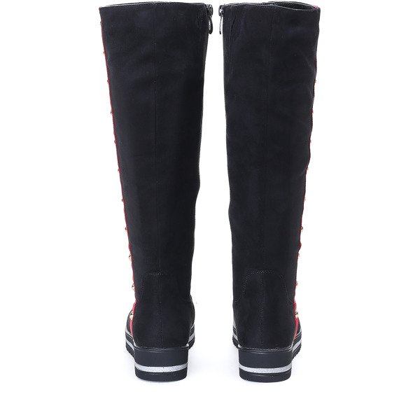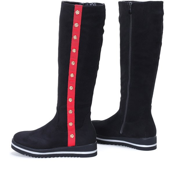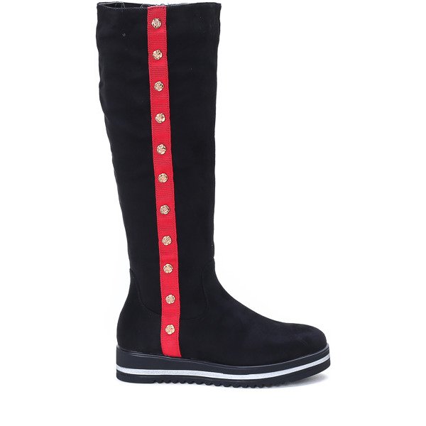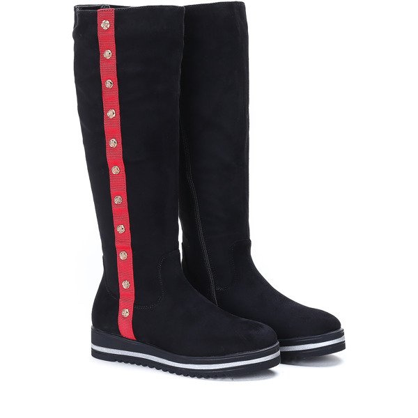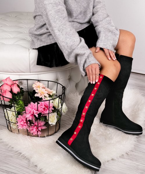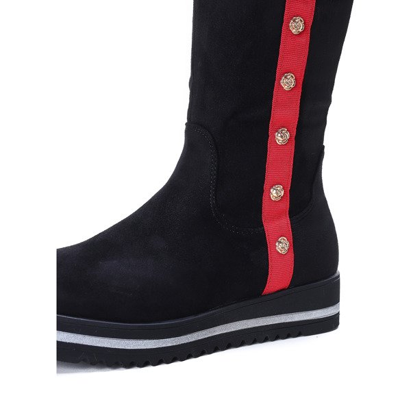- Rewelacyjne kozaki na platformie wykonane z ekologicznego zamszu. Cholewka zdobiona czerwoną tasiemką i dżetami w kształcie róży. W środku delikatne ocieplenie w formie futerka. Buty zapinane na suwak. Stanowią świetne połączenie z jeansami!
