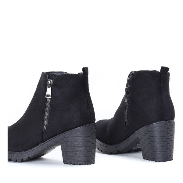- Klasyczne botki na grubym obcasie wykonane ze skóry ekologicznej zamszowej. W środku posiadają ocieplenie w formie futerka. Model zapinany na suwak po boku. Prosty fason, który pasuje do wielu codziennych stylizacji.