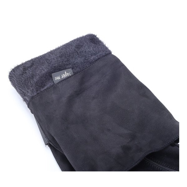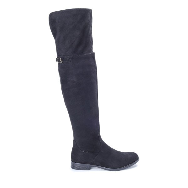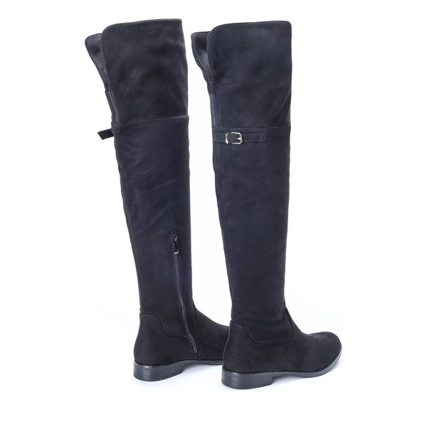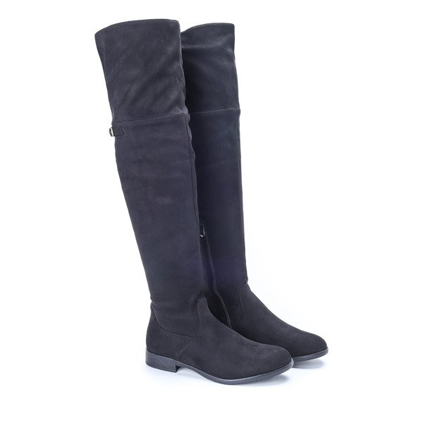 • Długie kozaki na płaskim obcasie wykonane ze skóry ekologicznej zamszowej. Model zapinany suwakiem po boku. Posiadają z tyłu sznureczek, którym można regulować szerokość górnej części cholewki. Idealne na co dzień jak i na wieczór.