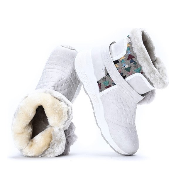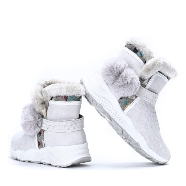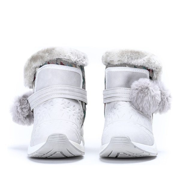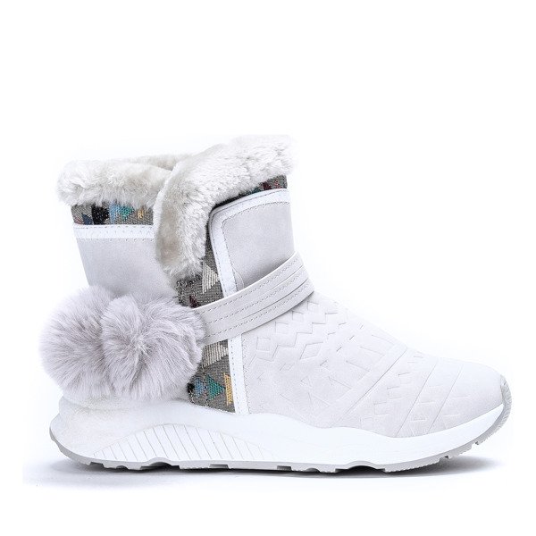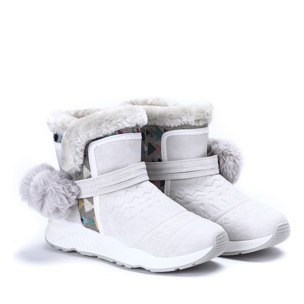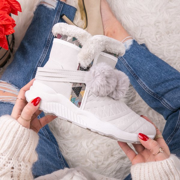 - Niesamowicie wygodne śniegowce zdobione pomponami. Cholewka wykonana z połączenia tkaniny oraz skóry ekologicznej matowej, który wykończonym jest azteckim wzorem. W środku posiadają ocieplenie w formie futerka.