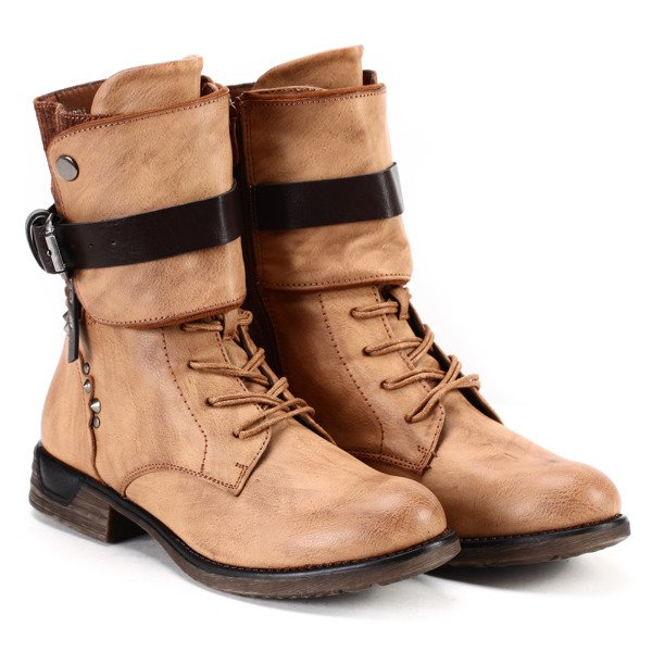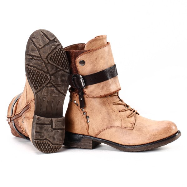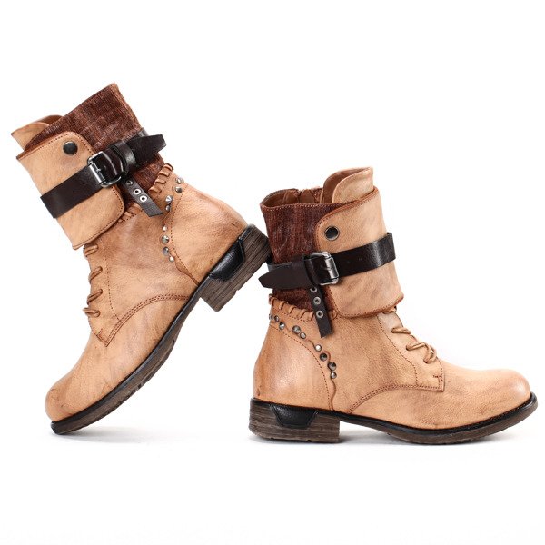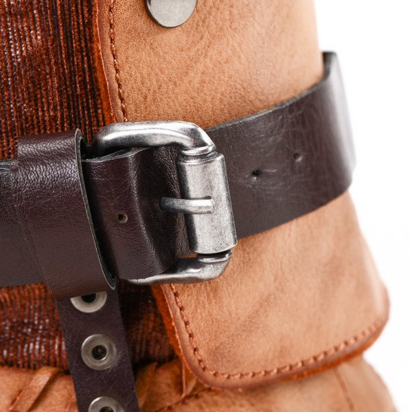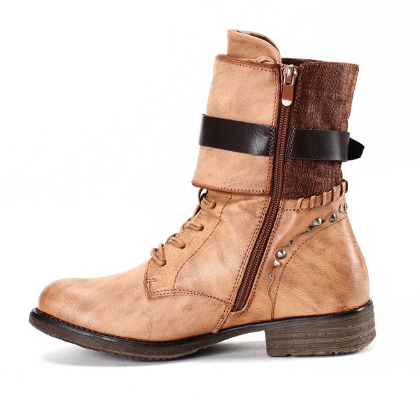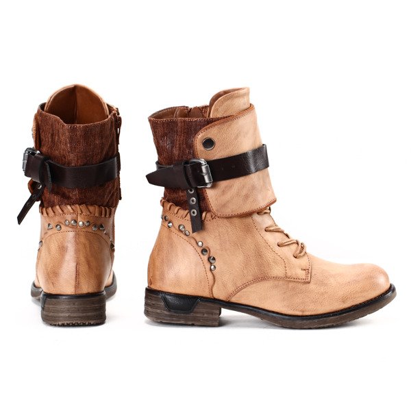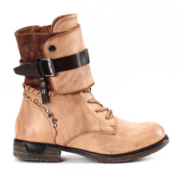 - Wyjątkowe botki z finezyjnie wykończoną cholewka. Model ozdobiony delikatnymi ćwiekami. Na górze na tle prążkowanego materiału szeroki zapinany na nap pas i mniejszy, kontrastowy pasek z klamerką. Botki zapinane na zamek i regulowane sznurowaniem.