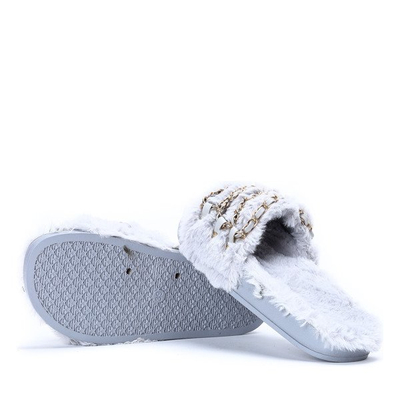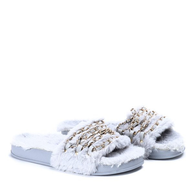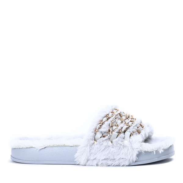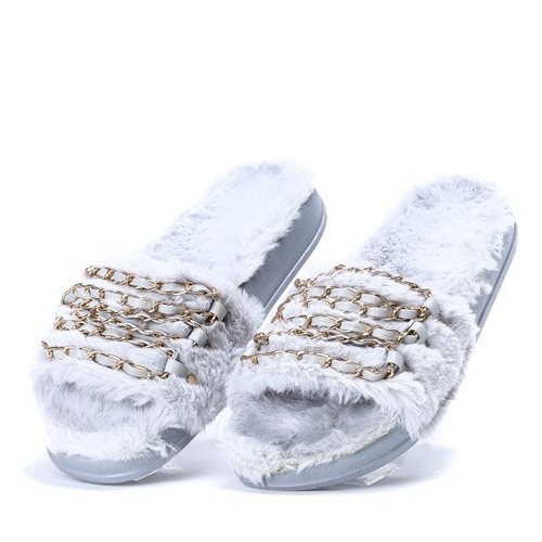 • Urocze klapeczki z ozdobnym futerkiem wykonane z tworzywa gumowego. Na paseczku złoty łańcuszek. Obuwie bardzo wygodne. Idealne na co dzień!